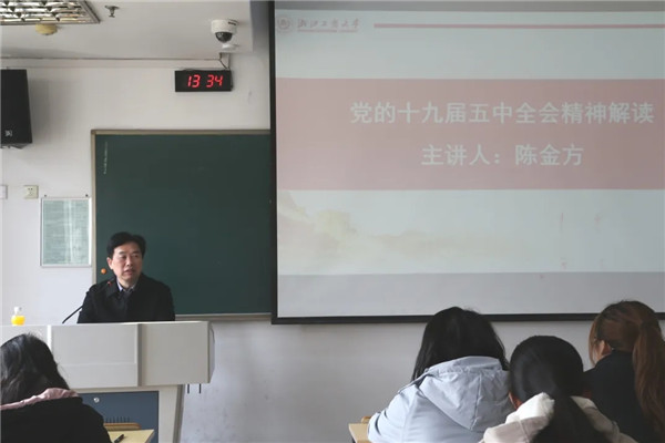 12月24日下午,校纪委书记陈金方以“党的十九届五中全会精神解读”为主题,为澳门百家乐论坛 新闻1901班、广告1901班本科生上了一堂生动而深刻的思政课。