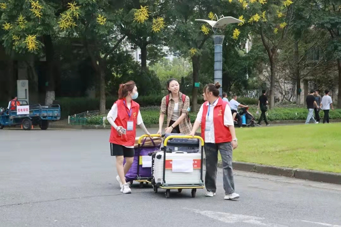 疫情防控期间,学生家长无法陪同新生入内,全程由志愿者带领检查入校码、测量体温等。虽然提着大包小包,但他们不埋怨不娇气,跟着志愿者一步一步完成基础入校工作,虽然风尘仆仆,但他们的眼睛里依然闪烁着期待的光芒。