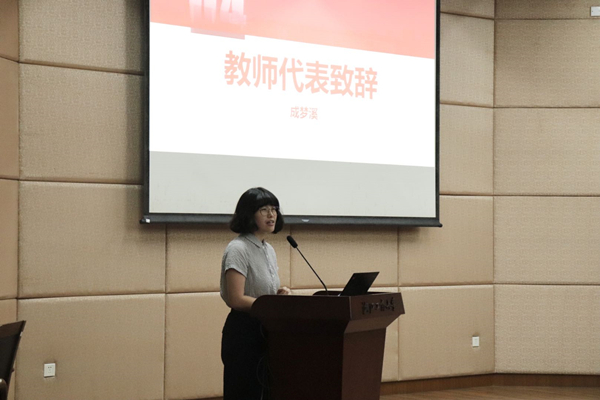 在各位系主任发言结束后,成梦溪老师代表学院全体教师向新同学们表示了欢迎。未来的世界充满挑战,成梦溪针对爱情、友情、亲情三个方面提出了自己的意见和建议。“大学很大,因为它广阔的生存空间,更因为它广阔的精神空间。只有把厚重的生命状态作为基底,才能有一个好的精神状态。”她希望每一位同学都能成为他们想成为的人。