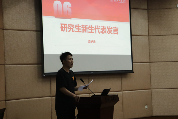 研究生新生代表孟子涵首先向老师和学校表达了感谢。从“国家当富强,始基端在商”一句歌词出发,他表达了对商大的喜爱;同时,他肯定了人文的力量,当代大学生有着时代的使命与担当,我们更应该不负国家和时代的期盼,用理想与奋斗去谱写我们的华丽篇章。