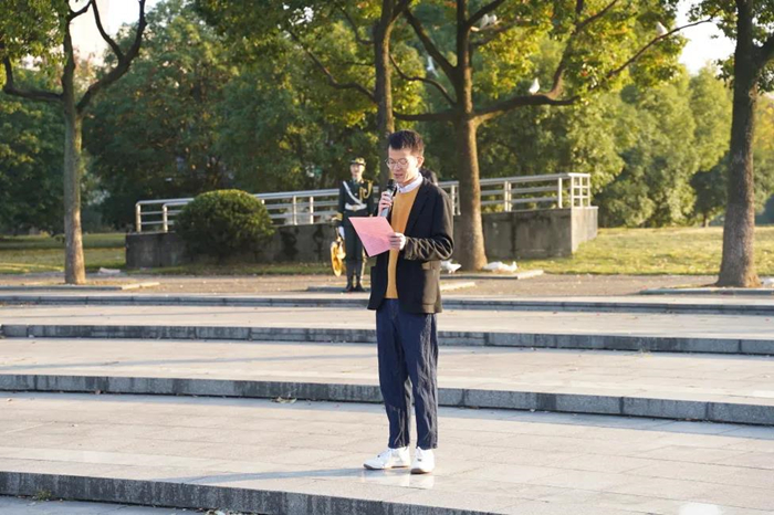 随后,21级本科生辅导员易正逊作了以“百年党史与你的青春模样”为主题的国旗下讲话,鼓励生活在新时代的大学生,从历史和现实中,从自身的坚持中,汲取榜样的精神和力量,坚持自己的闪光点,去努力实现个人梦、商大梦和中国梦。