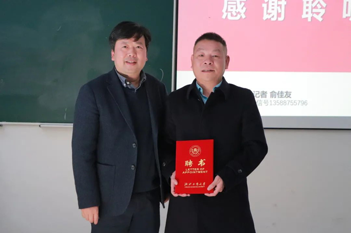 图为浙江工商大学党委委员、组织部部长袁金祥为俞佳友老师颁发实务精英聘书