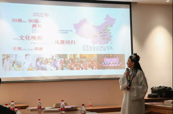 唱道文化教育集团董事长、中华诗教研究院院长胡维瑾认为,婷婷姐姐使诗教传播实践经历从0到1的发展,唱道文化教育集团又将其推进到1到10的进步,在未来,诗教传播实践从10到100到1000的飞跃,需要依靠全社会的力量和大家的支持。每座城市有自身的脉搏,古诗词可以用来唤醒不同城市文化的脉搏,希望能有更多人加入其中,展开多元化的诗词传播和推广活动。六年来,婷婷姐姐以传播和弘扬中华优秀传统文化为己任,以经典古诗文为蓝本,打造了《婷婷唱古文》和《婷婷诗教》两大品牌,其中《婷婷诗教》2017年曾入选中国唯一“全球创新教育100强”。婷婷姐姐在深入讲解诗文的同时,把学习诗歌与现实生活紧密结合,让听众在诗文之外学有所得、学有所用。中华诗教研究院,将以传统文化活动服务社会和政府,以产品传播传统文化理念和生活方式,以传统教育赋能学校、幼儿园、各界机构。