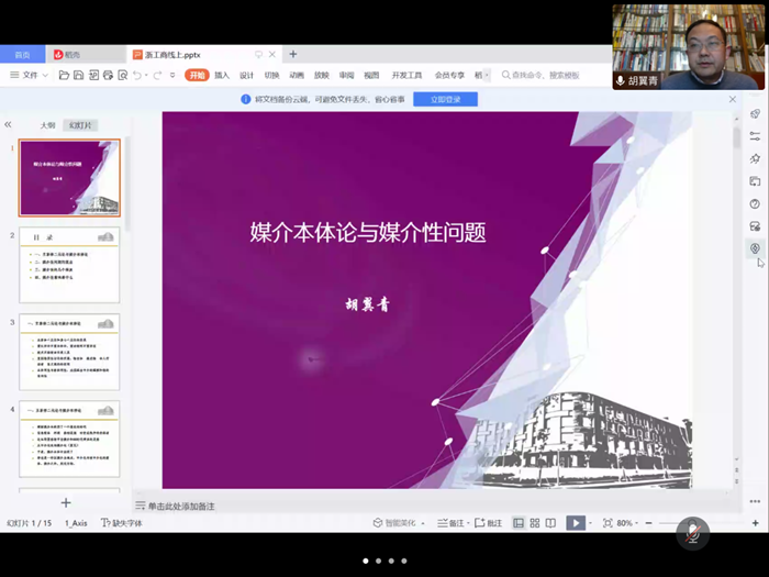 3月29日下午,南京大学新闻传播学院副院长、教授、博士生导师胡翼青教授于腾讯会议开展了《媒介本体论与媒介性问题》主题讲座。此次讲座由浙江工商大学社会科学部主办、澳门百家乐 承办,澳门百家乐 副院长李蓉教授主持,网新系主任沈珉、新闻系主任刘征、新传专业徐少丹、李骏、厉国刚、李至颖、张雅娟老师和21级新传研究生以及新闻系部分本科生参与了此次讲座。