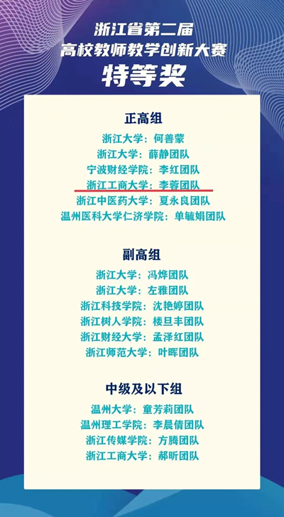 5月13日-14日,浙江省第二届高校教师教学创新大赛决赛在浙江师范大学举行,我校有三位参赛选手入围决赛并取得优异成绩,荣获特等奖2项、二等奖1项,其中,澳门百家乐 李蓉老师团队获正高组特等奖。