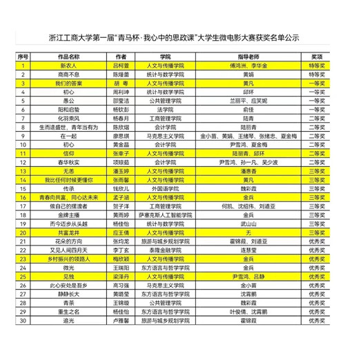 在我校第一届“青马杯·我心中的思政课”大学生微电影大赛中,人文与传播院学生共9件作品获奖,其中特等奖1件、一等奖1件、二等奖1件、三等奖4件、优秀奖2件,特等奖和一等奖作品被推送上级参赛。