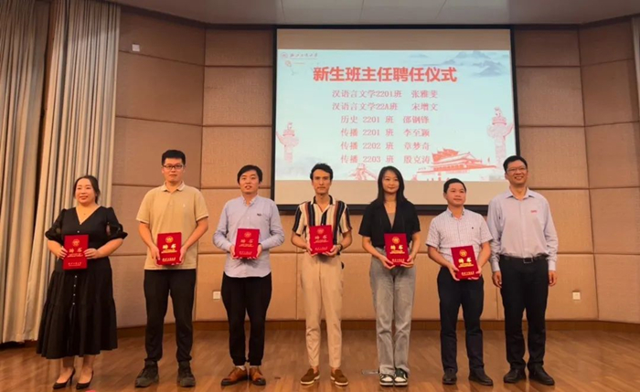 郑晓东书记为张雅斐老师、宋增文老师、邵钢锋老师、李至颖老师、章梦奇老师、殷克涛老师等六位新生班主任颁发聘书。班主任也逐一发表了对新生们的寄语。