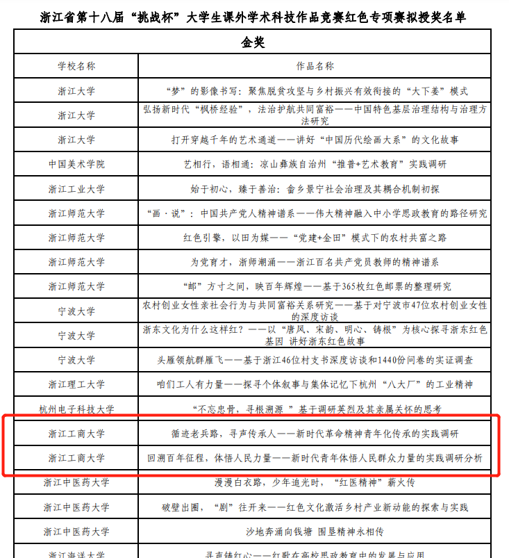 近日,由浙江省大学生创新创业大赛组委会主办的浙江省第十八届“挑战杯”大学生课外学术科技作品竞赛红色专项赛落下帷幕。澳门百家乐论坛 《循迹老兵路,寻声传承人一一新时代革命精神青年化传承的实践调研》和《回溯百年征程,体悟人民力量一一新时代青年体悟人民群众力量的实践调研分析》两项作品皆在比赛中斩获金奖,包揽了我校在该项赛事上的所有金奖。